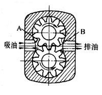 齒輪油泵的泵體中裝有一對(duì)回轉(zhuǎn)齒輪,一個(gè)主動(dòng),一個(gè)被動(dòng),依靠?jī)升X輪的相互嚙合,把泵內(nèi)的整個(gè)工作腔分兩個(gè)獨(dú)立的部分。A為吸入腔,B為排出腔。齒輪油泵在運(yùn)轉(zhuǎn)時(shí)主動(dòng)齒輪帶動(dòng)被動(dòng)齒輪旋轉(zhuǎn),當(dāng)齒輪從嚙合到脫開時(shí)在吸入側(cè)就形成局部真空,液體被吸入。被吸入的液體充滿齒輪的各個(gè)齒谷而帶到排出側(cè),齒輪進(jìn)入嚙合時(shí)液體被擠出,形成高壓液體并經(jīng)泵排出口排出泵外。