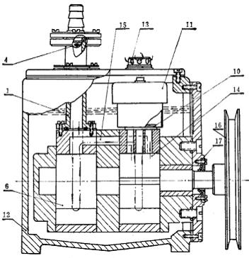 1.2X-1型泵:圖1是2X-1型雙級旋片式真空泵的剖面圖。氣體被抽除的路徑由圖中箭頭所示。排氣活門(閥片10)是用耐油橡膠板做成。為防止固體微粒落入泵內(nèi)損傷表面,特在進(jìn)氣管里裝有進(jìn)氣濾網(wǎng)(4)。在排氣閥上裝了油氣分離室(11),用它把被抽氣體所帶的油滴與氣體分離開,油流回箱里,氣體與部分油霧混合物排到大氣中去。整個泵體浸在油箱(12)中,淹沒泵的排氣閥,從而保證整個泵體密封。軸封(17)用的是耐油橡膠密封墊圈,用壓板在軸外固定。