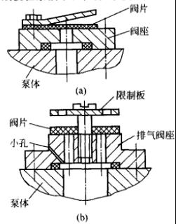 排氣閥是旋片泵主要易損件之一,將影響泵的抽氣性能并產(chǎn)生噪聲。排氣閥有兩種形式:一種是用橡膠墊做閥片,如圖1(a)所示;另一種是用布質(zhì)酚醛層壓板或彈簧鋼片做閥片,如圖1(b)所示.排氣閥必須浸在泵油中.在排氣過(guò)程中,壓縮氣體推開排氣閥片。穿過(guò)泵油后排出。泵油起到密封作用。